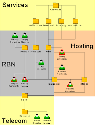 Dział hostingu zajmuje się zamieszczaniem stron w internecie. Za dział ten opowiadają: Aleks Bakchtiarow alias Władimir Kuzniecow – odpowiada między innymi za rejestrację domen. Władimir Kuzniecow – właściciel wielu domen, według iDefense jest ściśle związany z RockPhish Group, o której już wspominałem. Dział łączności (telekom) odpowiada za sprawy techniczne związane podłączeniem z internetem. Podlegają im AS Silvement i SBtel zapewniające podłączenie do Petersburskiego neutralnego węzła wymiany ruchu IP (SPB-IX) połączonego z Moskiewskim punktem (MSK-IX). Dział Serwises, zajmuje się zwyczajnym hostingiem. Siedziba RBN została zlokalizowana pod adresem